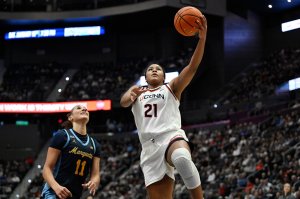 Students started chanting for 7-foot-9 center Olivier Rioux with more than six minutes to play. The world’s tallest teenager — standing 15 inches taller than any of his opponents — entered in the final minutes and got a dunk for his first collegiate field goal.