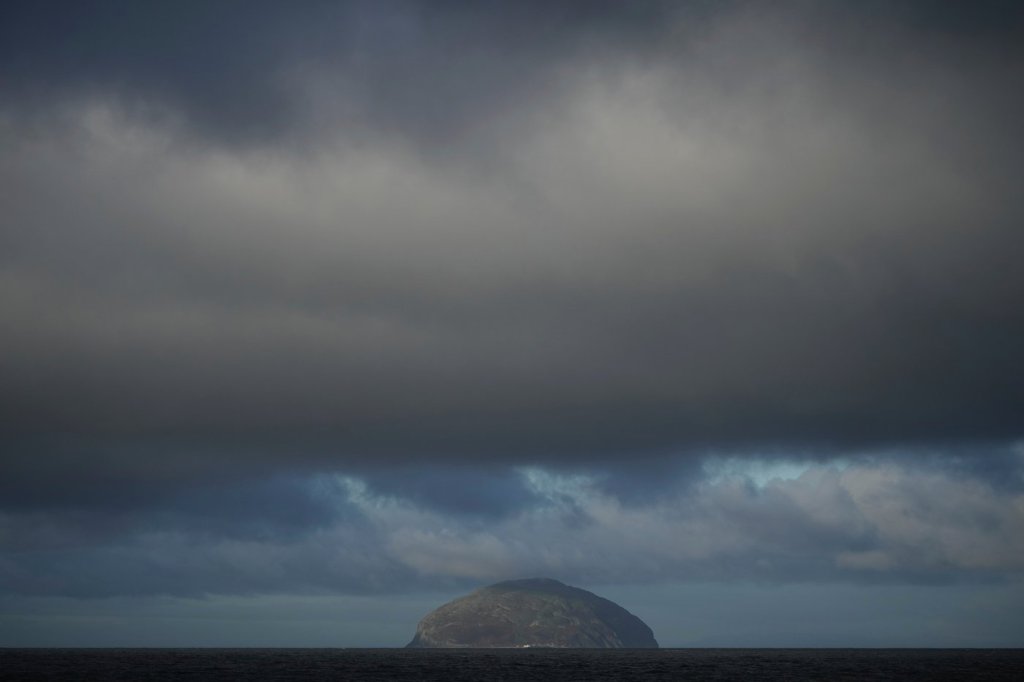 The island of Ailsa Craig, where the two types of granite, Common Green and Blue Hone, that are used to make curling stones is quarried from, is seen from the beach at Girvan, Scotland, Thursday, Nov. 13, 2025. (AP Photo/Alastair Grant)