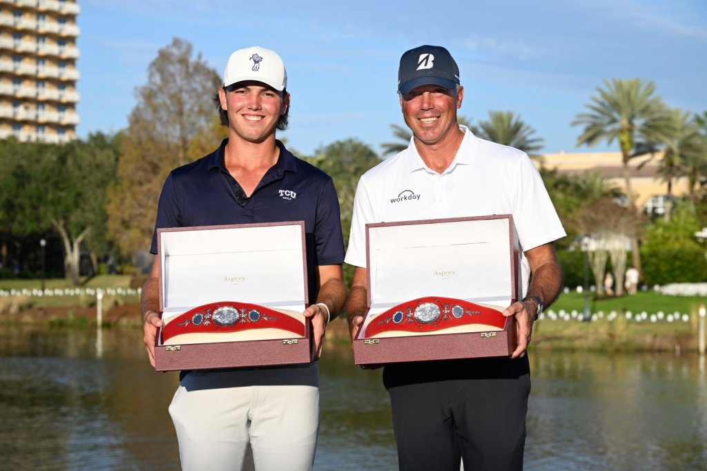 John Daly and John Daly II, a senior at Arkansas and the Southern Amateur champion, made eagle on the last hole for a 59 to tie for second with Davis Love III and Dru Love (58). Nelly Korda and her father, and Steve Stricker and his daughter, finished another shot behind.