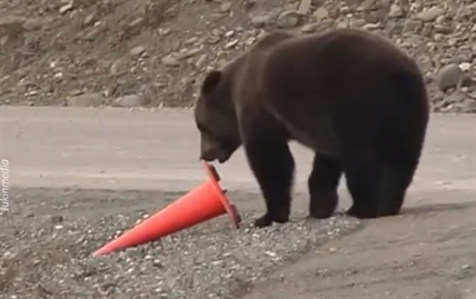A grizzly bear gave Alaskan road crews a hand by picking up a traffic cone that had fallen over.