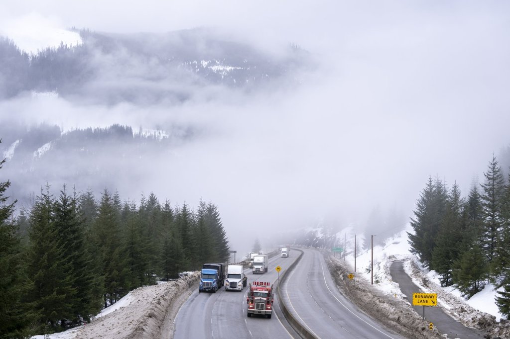The late winter blast continues in the Interior, where the Coquihalla Highway, the Okanagan Connector and Highway 3 from Grand Forks to Creston and from Hope to Princeton are all under winter storm warnings.