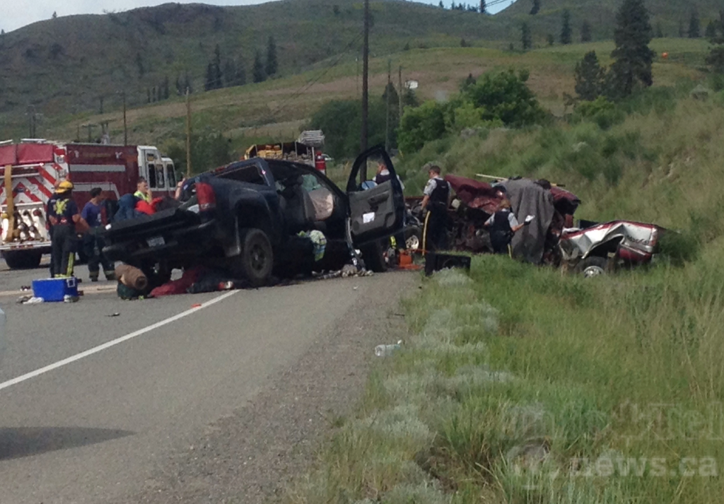 KAMLOOPS – One person is dead after two pickup trucks crashed on Highway 5 north, north of the Rayleigh ball fields Monday afternoon.