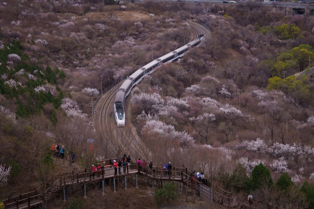 A China high speed train passes by blooming peach blossoms next to the Juyongguan Great Wall outside Beijing, China, Monday, March 30, 2026. (AP Photo/Vincent Thian)