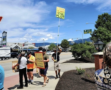 His signs aim to counter the Action4Canada narrative that claims yoga opens your body to satanic possession with signs that say “yoga is not an evil plot” and “this rally lacks logic.”