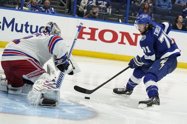 Nikita Kucherov and Ondrej Palat assisted on the winner with 6 1/2 minutes left, with the puck deflecting off Stamkos’ knee into the net after Rangers goalie Igor Shesterkin stopped the initial shot.