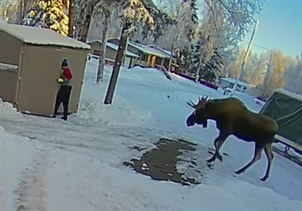 ANCHORAGE, Alaska – An Alaska man carrying garbage to his shed had to take cover…