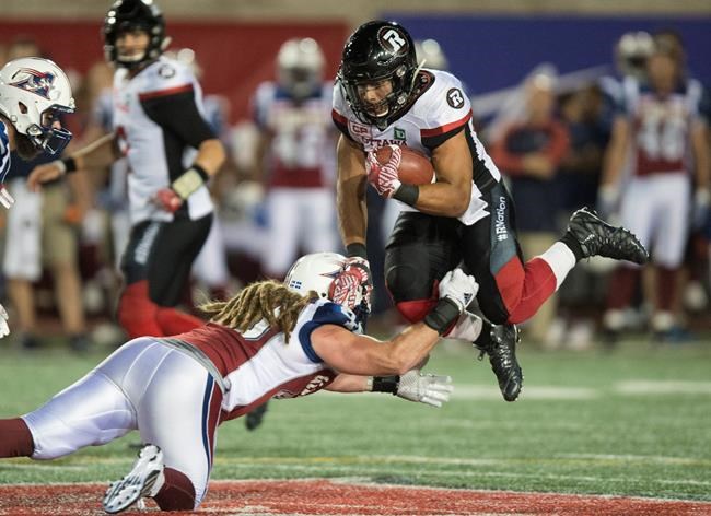 TORONTO – Ottawa quarterback Trevor Harris, Redblacks teammate Chris Williams and Calgary running back Jerome…
