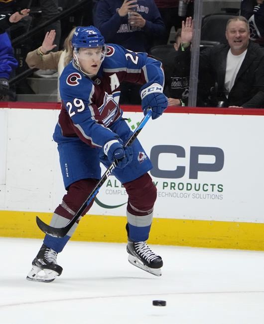 DENVER (AP) — Nathan MacKinnon scored four goals to extend his career-best points streak to…