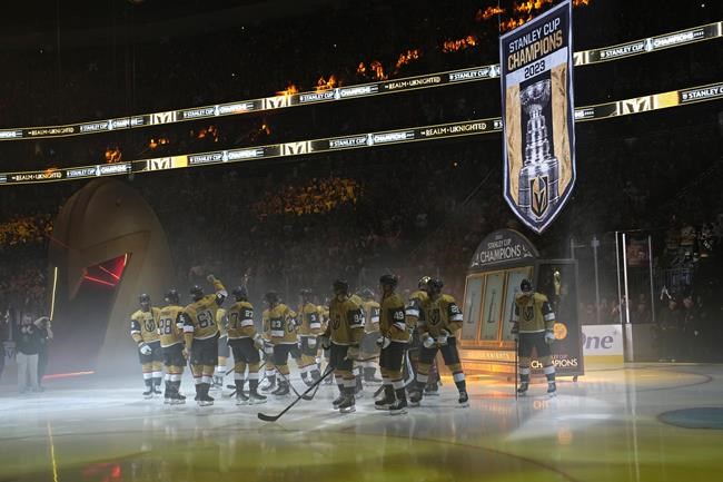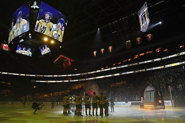 LAS VEGAS (AP) — The Golden Knights raised their Stanley Cup championship banner in the…