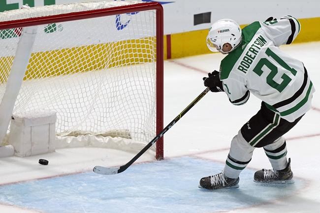 DALLAS (AP) — Red-hot Jason Robertson tied it for Dallas with two goals in the…