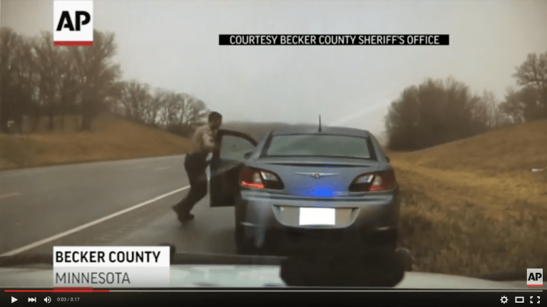 This amazing clip from a police cruiser's dash cam shows an officer getting out of…