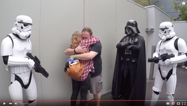 Darth Vader doesn't seem to be such a bad guy. He grabbed a couple Stormtroopers and helped Bryan Starr's wife surprise him with the news she is pregant. It all happened at Disney World with the help of the amusement park's employees. The touching video has gone viral with over 1.6 million views. %%embed1%%