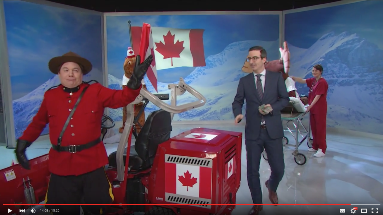 On Last Week Tonight with John Oliver, the host informed Americans that Canada was about to have a federal election. Oliver enlisted the help of Mike Myers, a beaver and a moose to handout some advice. And by the way, Myers drives into the studio on a snowblower wearing a Mountie uniform. %%embed1%%
