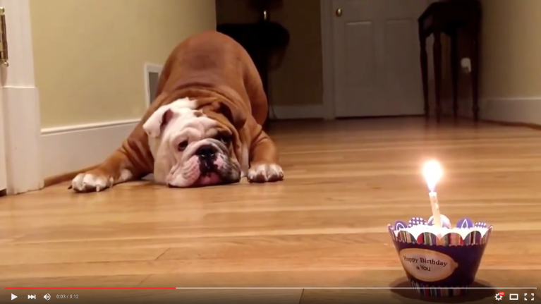 Yep. There are cupcakes for dogs. Desi the bulldog isn't sure what to make of the birthday pup-cake with a candle on top. Of course this adorable video is trending and heading toward viral status. Do you celebrate pet birthdays? %%embed1%%