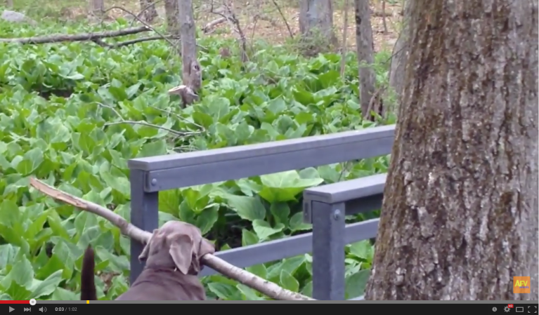 You've seen the videos of dogs failing with a big stick. This problem solving pup figures out what to do when you have a big stick and a narrow bridge. The clip from America's Funniest Videos has over 2-million views. %%embed1%%