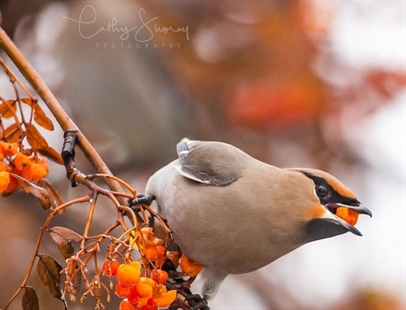 When a large flock of Bohemian Waxwings descended on a mountain ash tree near her…