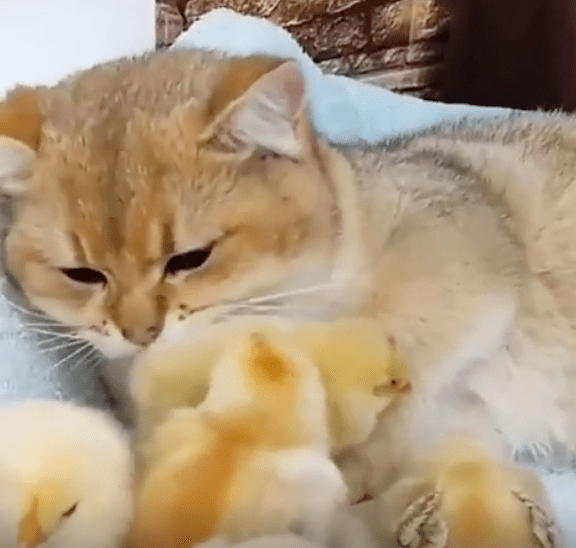 Against its natural killer instincts this cat has decided it wants to adopt some chicks. …